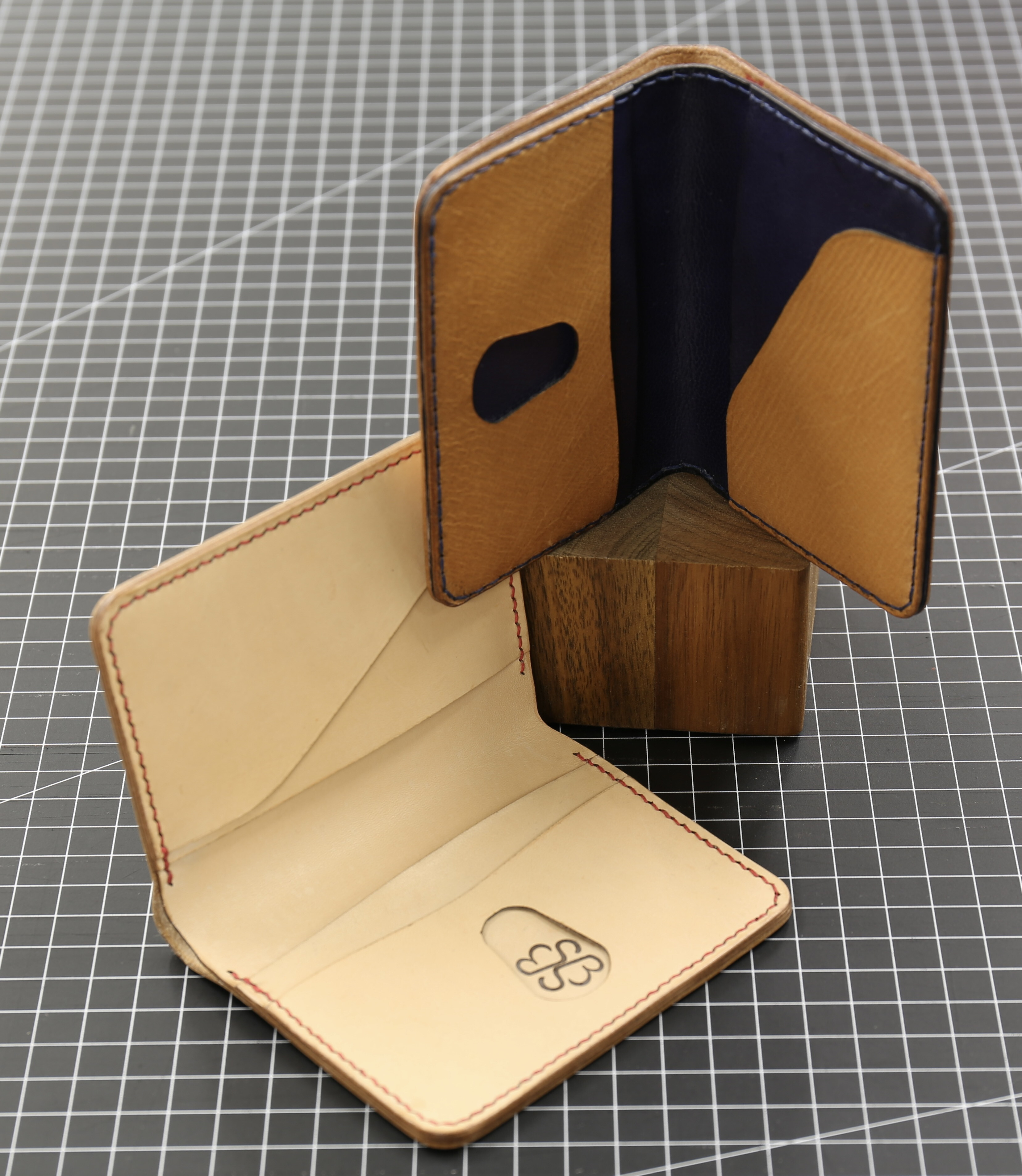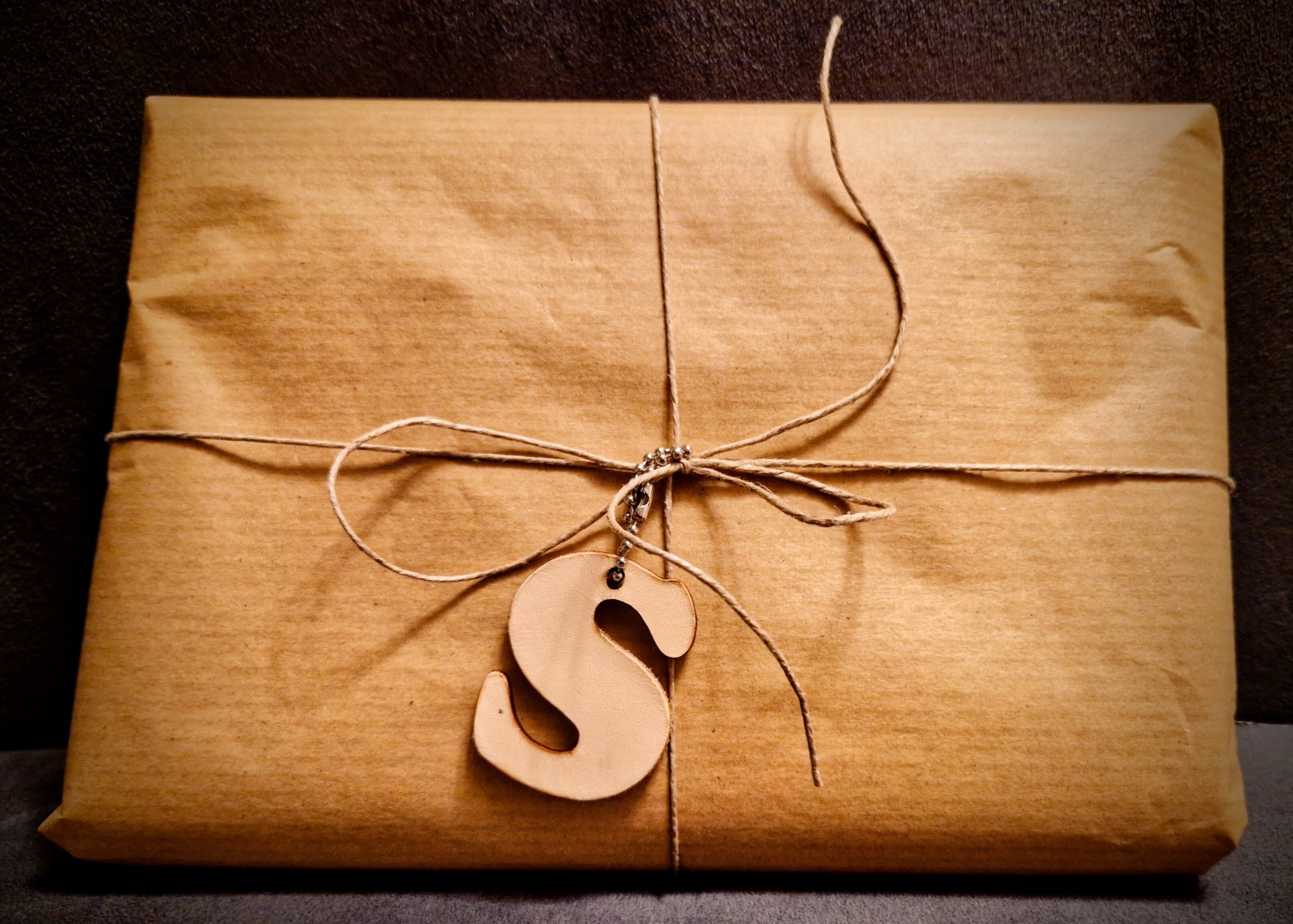 Lasergeschnittene Monogramme aus pflanzlich gegerbtem Vollnarbenleder ohne Ring.