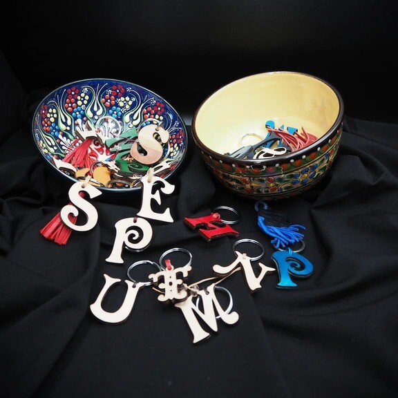 Lasergeschnittene Buchstaben aus toskanischem pflanzlich gegerbtem Leder, handgefärbt oder naturfarben. Der Spaltring ist aus Edelstahl AISI 304 oder massivem Messing.