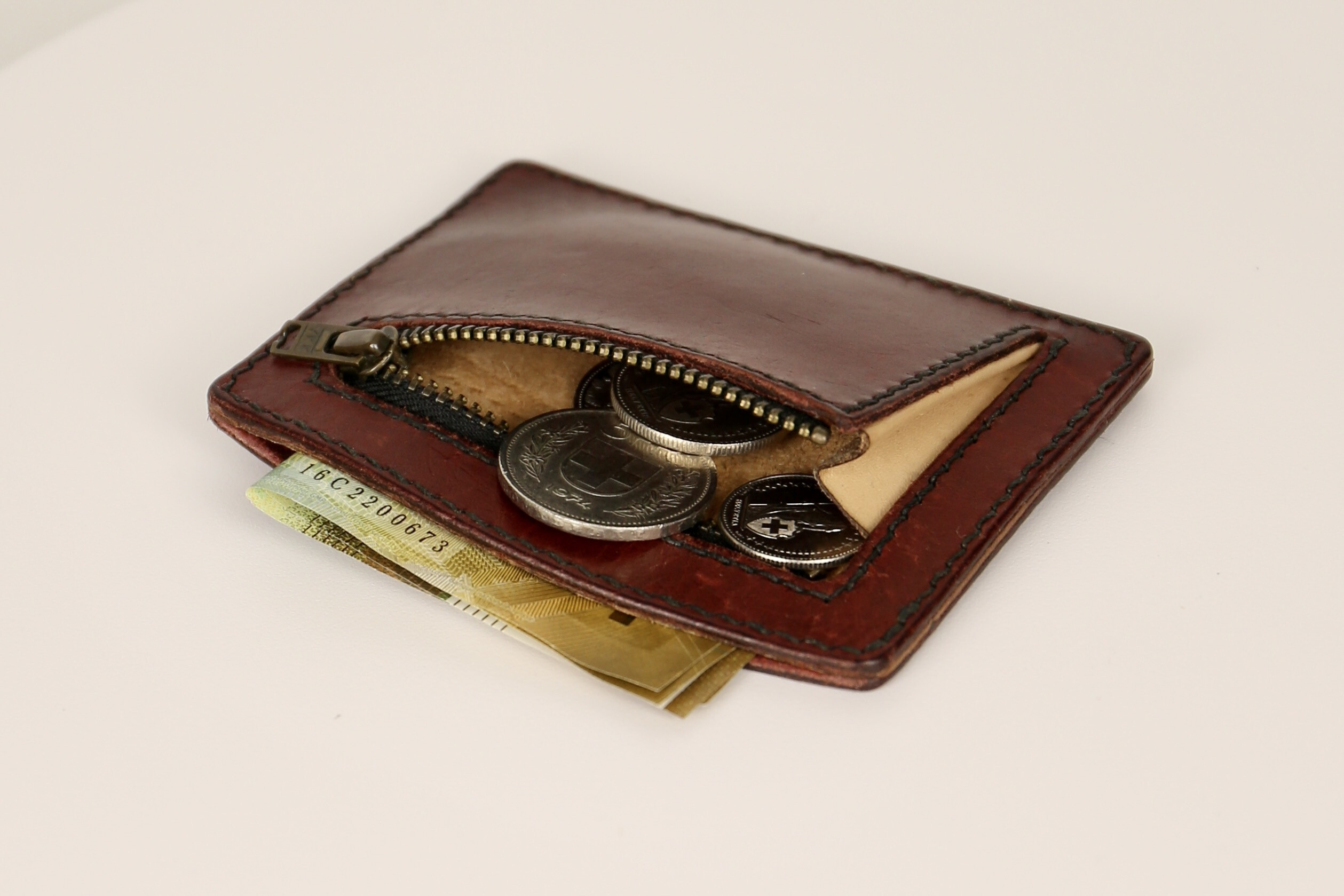 Das Modell "Pirmin" ist als kompakte Geldbörse konzipiert, die in die vordere Hosentasche passt und bequem Platz für vier Karten und Geldscheine bis zur Grösse eines 200-Schweizer-Franken-Scheins bietet.