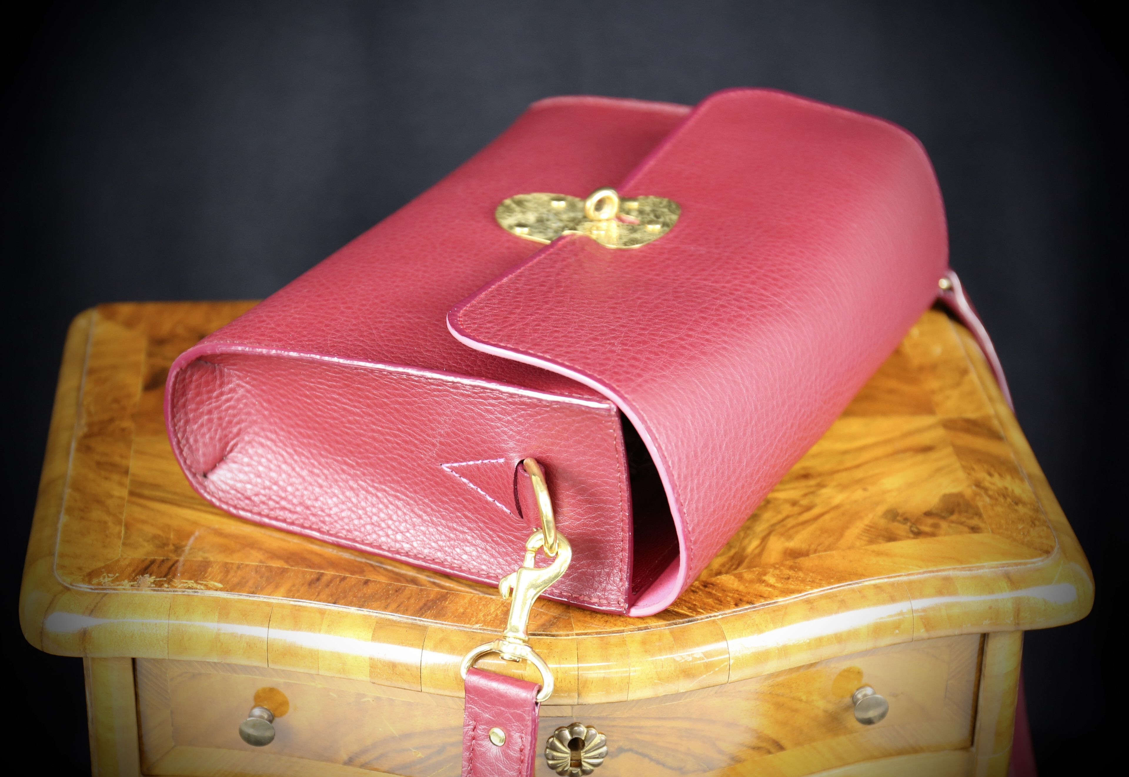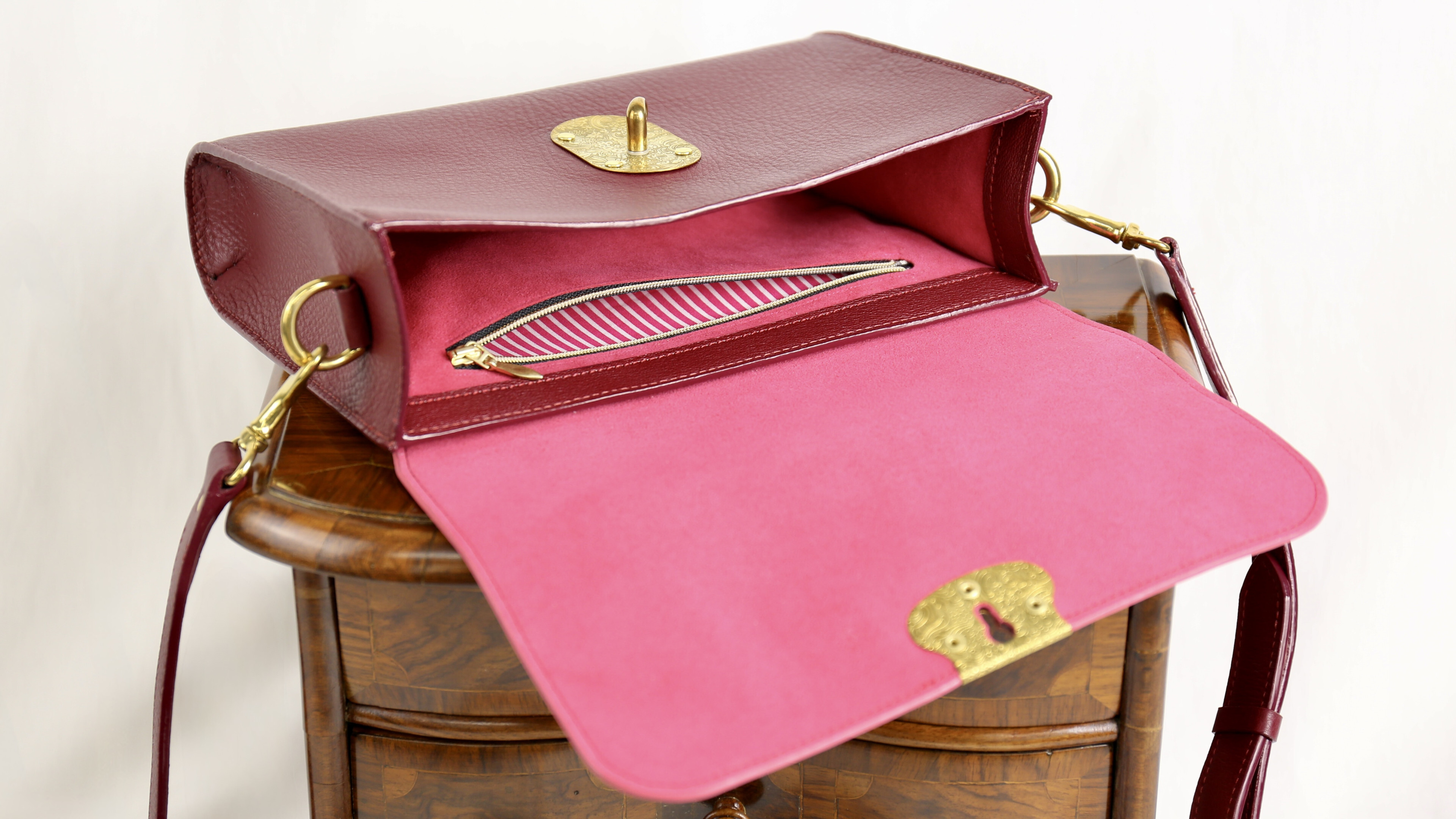 Das État Major-Schloss von Maison Poursin basiert auf dem Design von Husarenschlössern aus dem 19. Jahrhundert und besticht durch feine Ziselierungen und Weinreben-Motive. Sowohl das Schloss als auch alle weiteren Beschläge sind aus massivem Messing – unlackiert und ohne galvanische Behandlung. Die Kanten des Deckels sind farblich passend in Peony Pink (analog zum Innenfutter) bemalt, während der Rest der Tasche auf das Aussenleder abgestimmt ist. Die Taschenblende besteht aus 1 mm starkem Chèvre Grainé in Bordeaux.